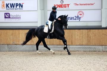 Sir Vegas ist ein großzügiger und kräftiger Hengst. Er ist gut auf die Reiterin fokussiert. Der Schritt zeigt sehr viel Raum und ist aktiv; der Hengst benötigt zeitweise noch Unterstützung der Reiterin, um dies gut über den Körper in einen konstant sauberen Viergang umzusetzen. Er lässt sich dabei gut führen. Der Trab ist sehr ausgeglichen, das Hinterbein kommt gut zum Tragen und verfügt über reichlich Kraft. Das Vorderbein wird mit Schulterfreiheit und Kniehebung eingesetzt. Der Galopp zeigt Kraft, Balance und einen guten Sprung. Sir Vegas wechselt leicht und zeigt zeitweise, dass er das Gewicht auf das Hinterbein verlagern kann. Der Kontakt ist konstant und stabil, könnte jedoch noch etwas geschmackvoller sein. Er folgt der Hand gut und bleibt dabei im Gleichgewicht. Sir Vegas hat eine sehr konstante Leistung gezeigt.