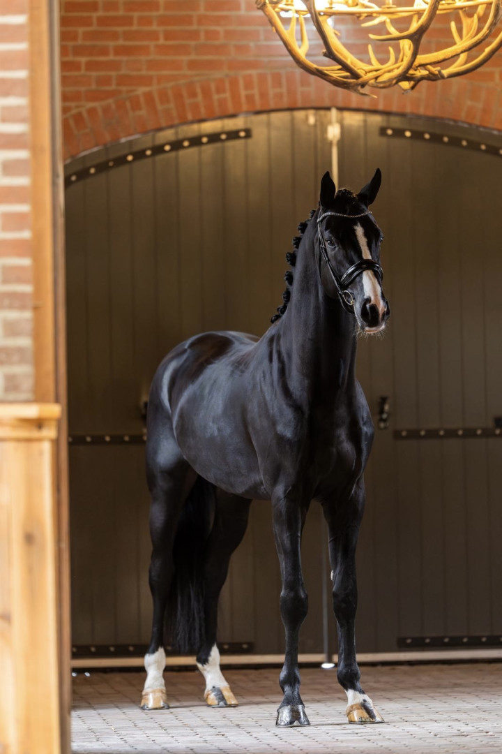 In terms of breeding we see many characteristics in him that we also saw in Vivaldi at the time. His lineage is very interesting with 2x Vivaldi in his pedigree. Dam sire Vitalis passes on a lot of rideability and attitude. Grand sire San Amour I is already in 8th place on the WBFSH-Sire ranking 2024. Royal Dynamic's sire Dynamic Dream, Champion of the Westphalian inspection, made a huge impression on us as a young stallion during the stallion show in Schockemöhle/ Helgstrand. Dynamic Dream was 'Siegerhengst' in Westphalia and completed his 14-day test in Denmark with the expected dream scores: trot and canter 9.0. For his willingness to perform, interior and character a 10.