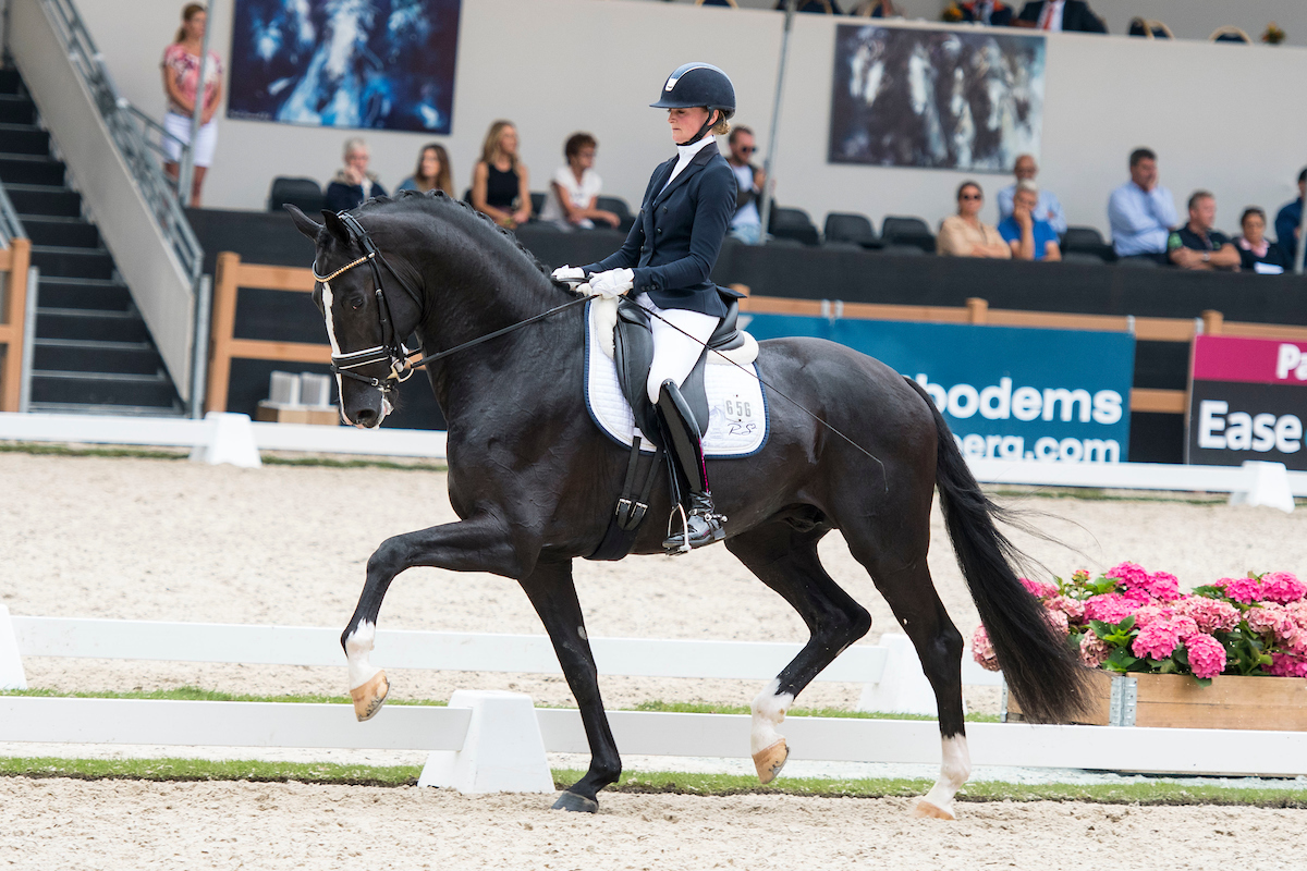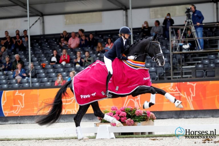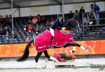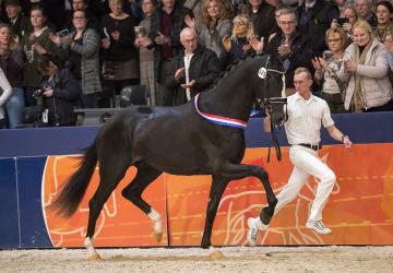 Met een monsterscore van 90 punten werd Hengstenkeuringskampioen en Pavo Cup-winnaar Jameson RS2 afgelopen woensdag ingeschreven voor het KWPN. “Jameson RS2 is een hengst die zich goed laat bewerken, een fijn karakter heeft en werklustig is. Een hengst die in draf en galop een hele goede bergoptendens heeft en een goed achterbeengebruik. In stap is hij af en toe iets gespannen en zou hij iets meer aan schrijden toe kunnen komen”, zei hengstenkeuringscommissievoorzitter Bert Rutten over de zwarte vierjarige. Hij kreeg een 7.5 voor de Stap, een 9.0 voor de Draf, een 10 voor de Galop, een 9.5 voor de Souplesse en een 9.5 voor de Houding en Balans. Jameson RS2 is gefokt door Stal 104BV en in eigendom van RS2 Dressage. Zo presteren en zoveel kwaliteit hebben, daarnaast is hij ook nogeens fantastisch gefok; Blue Hors Zack x Negro x Krack C x Contango uit de sterke moederstam van Fam. van Mook.