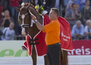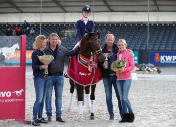 Zaterdag was een geweldige afsluiting van een lange maar prachtige week. Met 3 paarden in de Finale waarvan de door ons en Albert Drost gefokte merrie Haute Couture onder Dinja de Pavo Cup voor 5-jarige dressuurpaarden won is toch wel heel bijzonder.