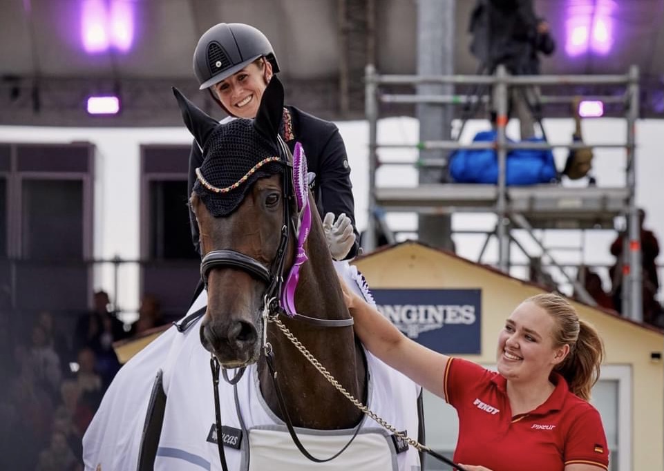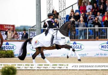 TSF Dalera BB van onze hengst Easy Game liet met Jessica von Bredow-Werndl weer een fantastische Kür op Muziek zien en ze gingen weer over de 90% grens en kwamen met 91,021% dicht bij de Tokio-score (91,732%). Dat dit de winnende rit in Hagen was is overduidelijk. Hoe vanzelfsprekend wil je een proef hebben. Maar er zaten ook wat kleine ‘dingetjes’ in de proef: iets wat de stap, maar ook een hakkeltje voor de galoppirouette (één sprong achter omgesprongen) en wat behoudend uitstrekken in galop. Maar dat is zeuren. Verdiend goud voor het duo.