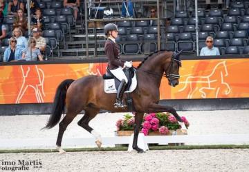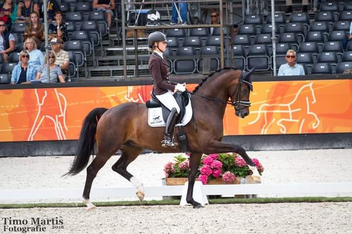 Het was dit jaar een beetje anders dan anders voor ons bij de Pavo Cup. Renate kon alleen maar de halve Finale op woensdag rijden omdat we op zaterdag 18-8-18 gingen trouwen. Het is wel heel toevallig dat dit samen viel met de Pavo Cup. Maar ja, 18-8-18 is ook wel een aparte datum :). Het was een prachtige trouwdag met super lekker weer, helemaal perfect. We beginnen even met de halve Finale voor 4-jarige dressuurpaarden op woensdag 15 augustus, met maar liefst 83 deelnemers. Renate stelde hier 2 van onze hengsten voor en heel succesvol; Johnny Depp een 5e plaats met 86.8 pnt en Just Wimphof een 11e plaats met 85 punten. De verschillen waren heel klein in deze kopgroep en veel toeschouwers hadden Just Wimphof nog hoger ingeschat omdat hij hij zeer natuurlijk voorgesteld werd en 3 zeer goede basisgangen liet zien. We denken met Johnny Depp en Just Wimphof 'echte'toppers in huis te hebben. Dus voor deze 2 jammer genoeg geen Finale meer. Dinja van Liere kreeg met onze prachtig gemodelleerde hengst Johnny Cash 80.4 punten waar we ook meer dan tevreden mee waren. Helaas hebben we Jaguar Matador, Charmeur x Painted Black af moeten melden omdat hij een week voorafgaand aan de Pavo Cup een dik been had en Miranda Rongen (zijn amazone) hem niet kon trainen. Dit getalenteerd paard, kreeg op de voorronde in Houten 84 punten en hebben we samen in eigendom met Vincent Wouters en Albert Drost.