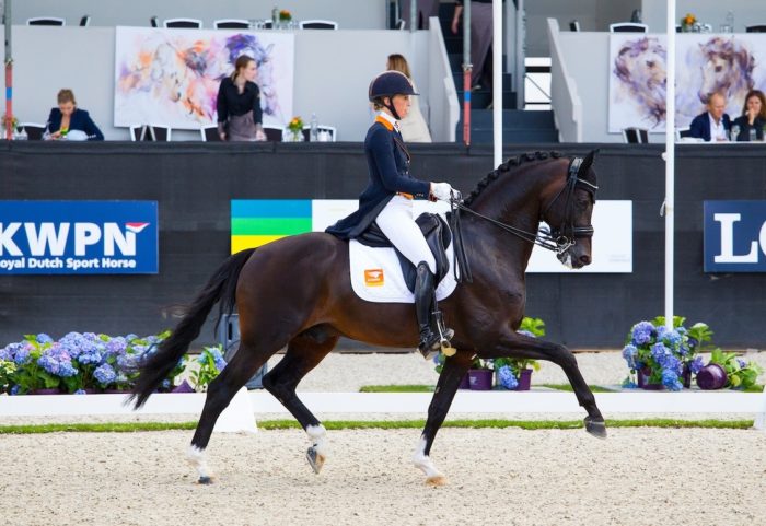 Onze KWPN-hengst Ferdeaux maakte vandaag, vrijdag 27 Oktober onder Kirsten Brouwer zijn debuut in de Lichte Tour. De Bordeaux-zoon liep in De Mortel met veel macht naar 70,33%. “Ferdeaux was sinds het WK voor Jonge Dressuurpaarden niet meer mee geweest. Ik vond dat hij heel lekker liep. Ik heb echt fijn gereden. Ferdeaux geeft zo’n wow-gevoel! Hij komt die baan binnen en laat zich dan met veel houding zien. Dat voelt echt heel machtig”, licht Brouwer toe. Kirsten vertelt dat de proef al vrij makkelijk ging. “Ferdeaux is een paard dat veel mee op pad moet. Afgelopen week had ik al een oefenwedstrijd gereden. We komen de proef al goed door, al kan het zeker nog strakker. Voor de zijgangen in draf en de uitgestrekte stap en de wissels hadden we mooie cijfers. De keertwendingen kunnen beter en ik moet zelf de pirouettes beter voorbereiden.” De door Gerrit en Anne-Marie van Esterik uit Ochten gefokte hengst gaat het selectietraject in voor de indoorkampioenschappen. “Zodra we bevestigde Lichte Tour-proeven rijden, gaan we ook internationaal op pad”, licht Brouwer toe.